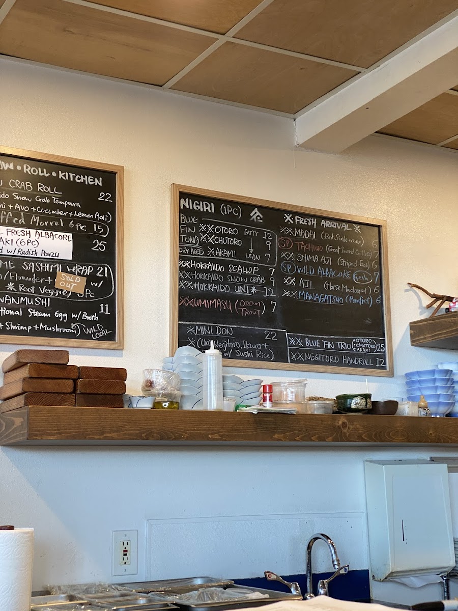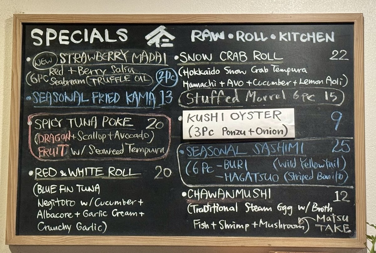 Crab salad, avocado, cucumber topped with Chef's choice fish of the day.